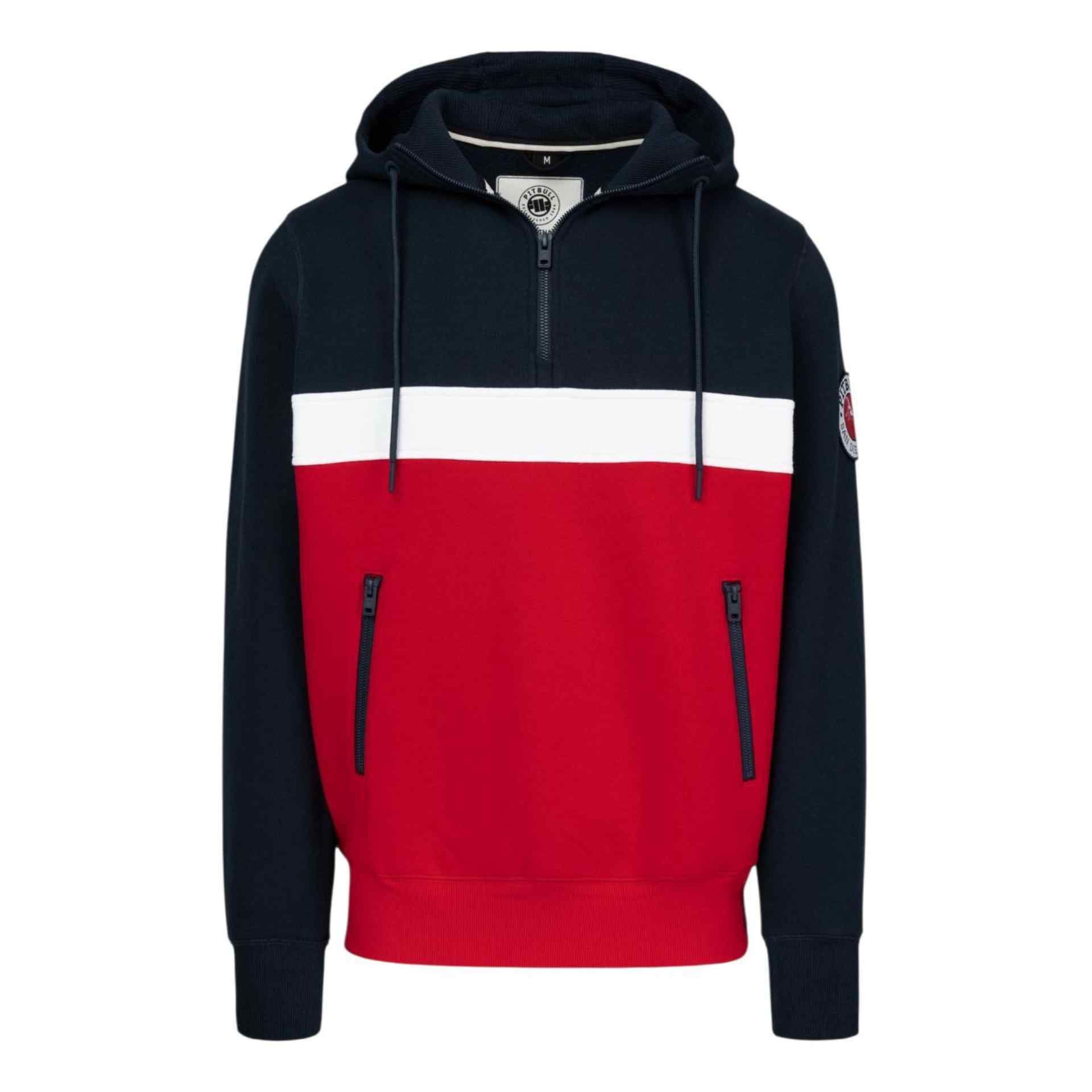 Dreifarbiger Pitbull-Sweater mit Kapuze und innenliegender Kängurutasche mit Reißverschluss. Der Half-Zip-Pullover kommt mit einer Stickerei auf der Kapuze sowie einem Pitbull-Patch auf dem linken Ärmel.