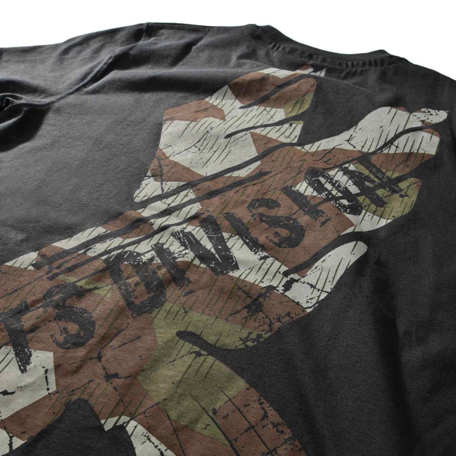 Auffälliges TS-Shirt mit großem Adler in Camouflage-Optik auf dem Rücken, der ein klassisches Thor Steinar Logo greift.