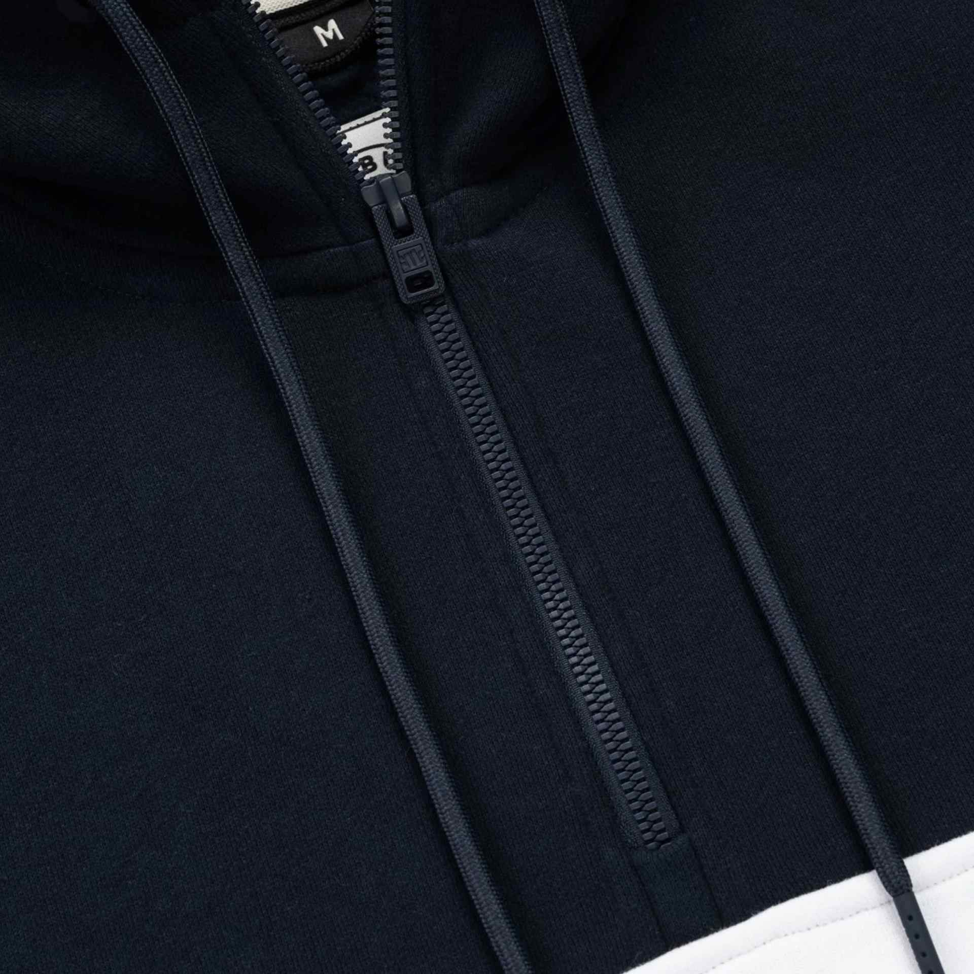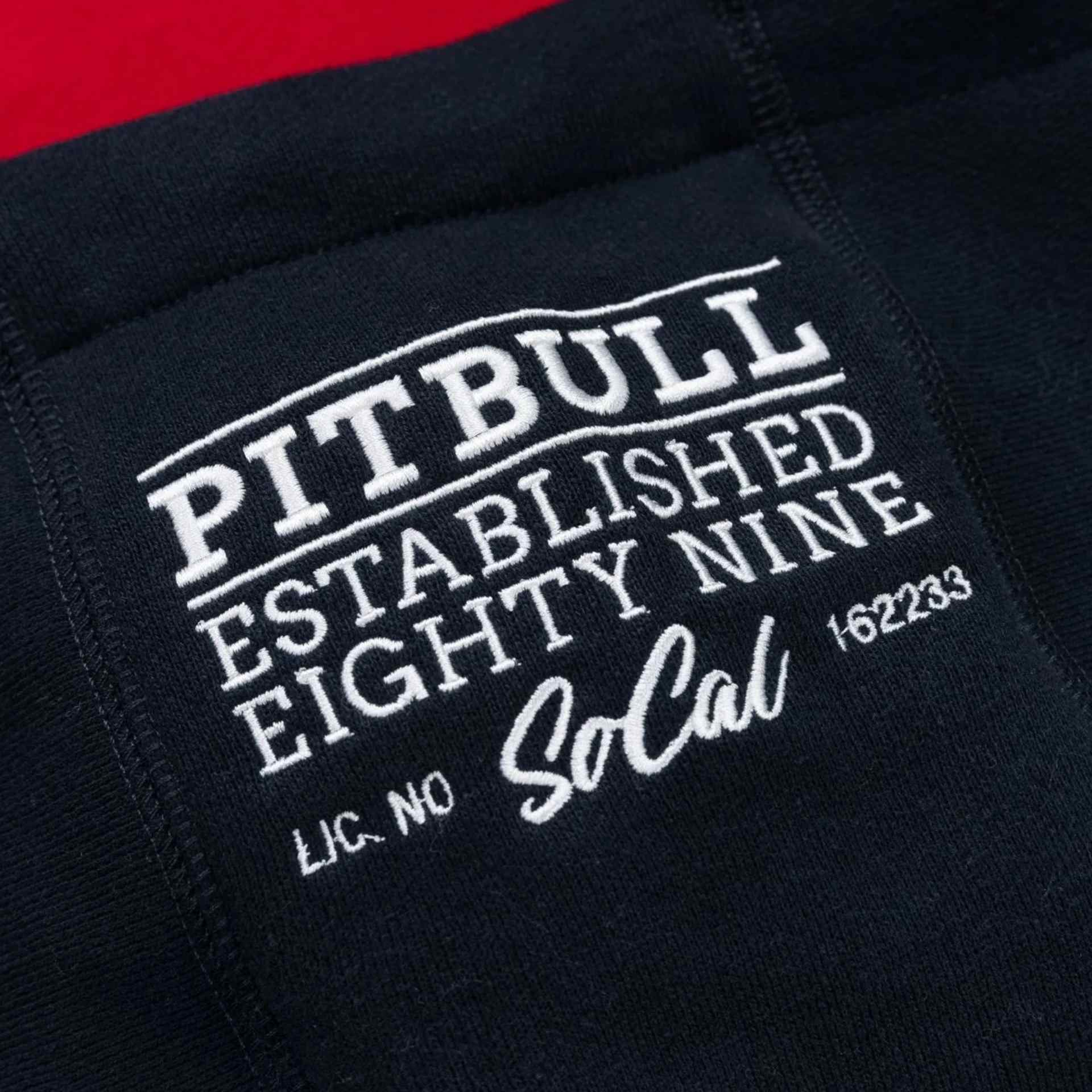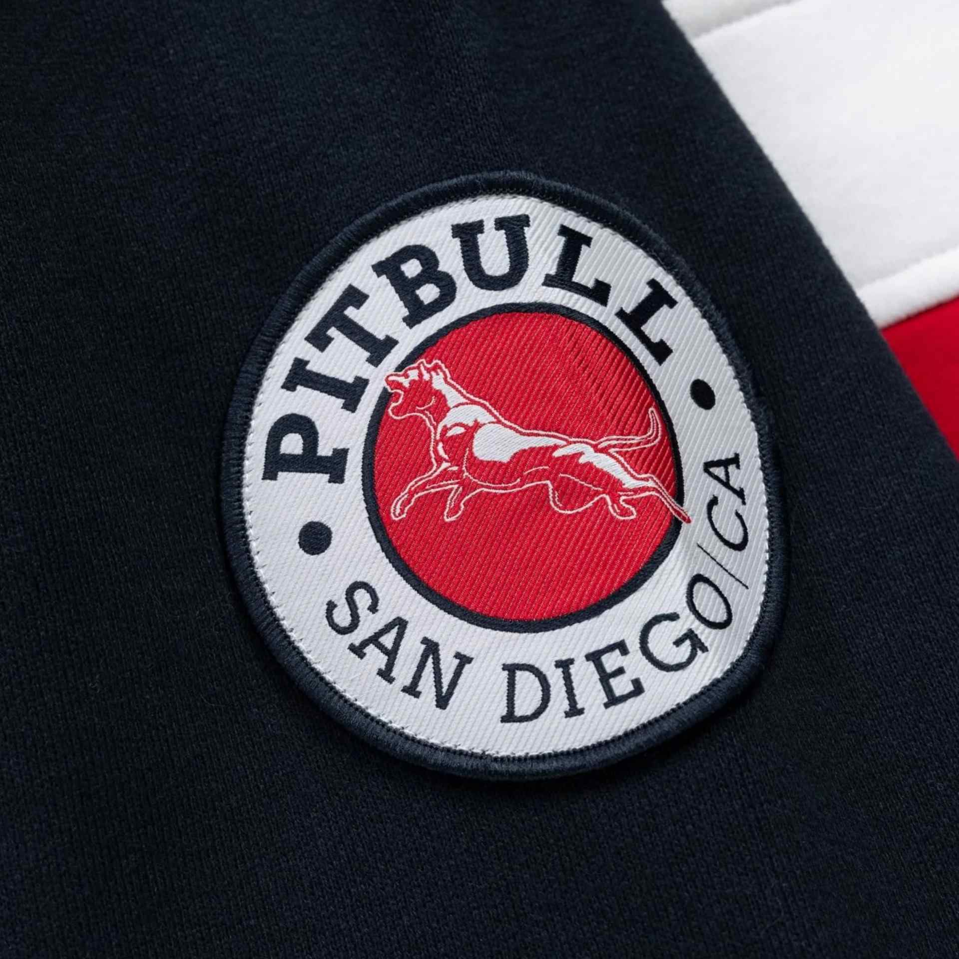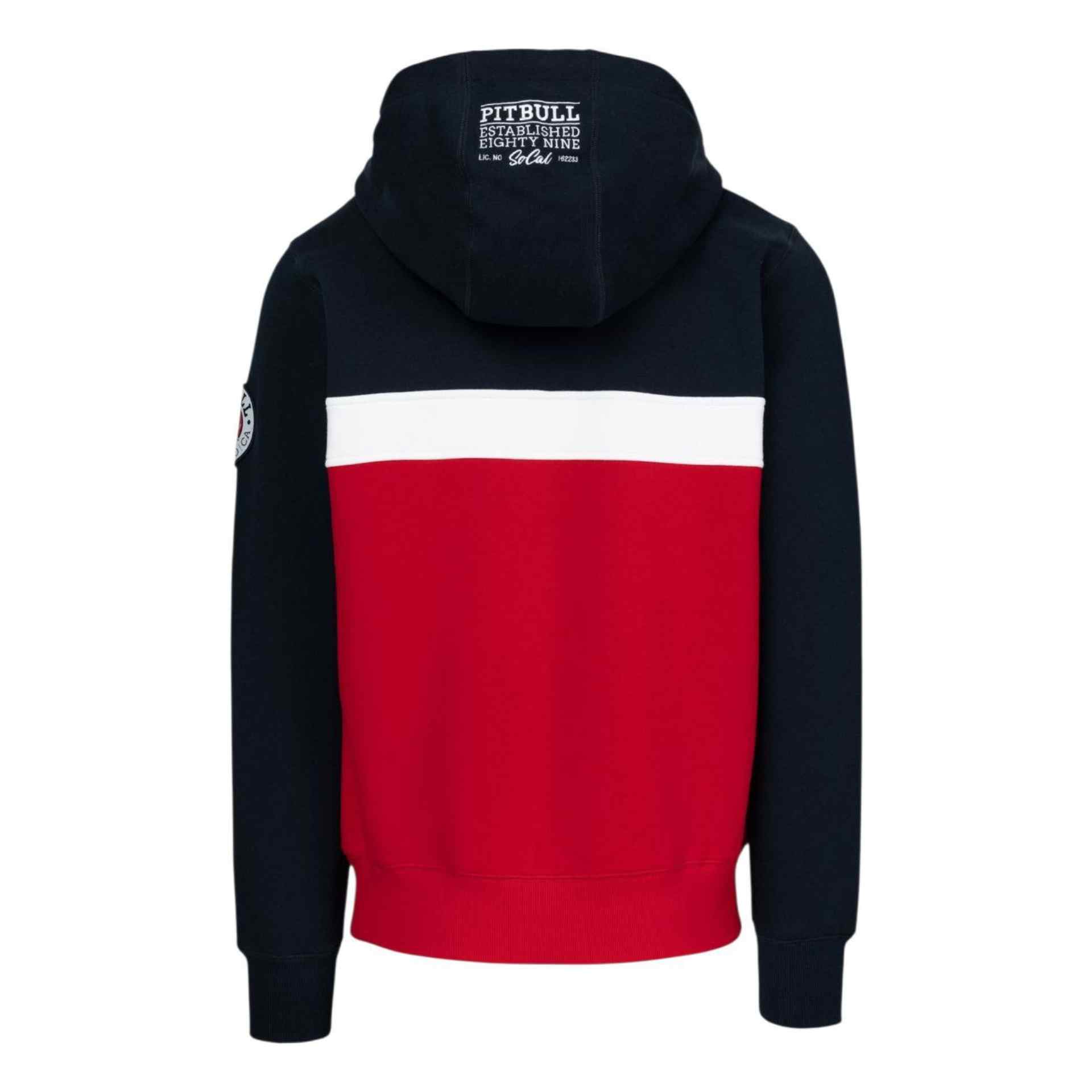Dreifarbiger Pitbull-Sweater mit Kapuze und innenliegender Kängurutasche mit Reißverschluss. Der Half-Zip-Pullover kommt mit einer Stickerei auf der Kapuze sowie einem Pitbull-Patch auf dem linken Ärmel.