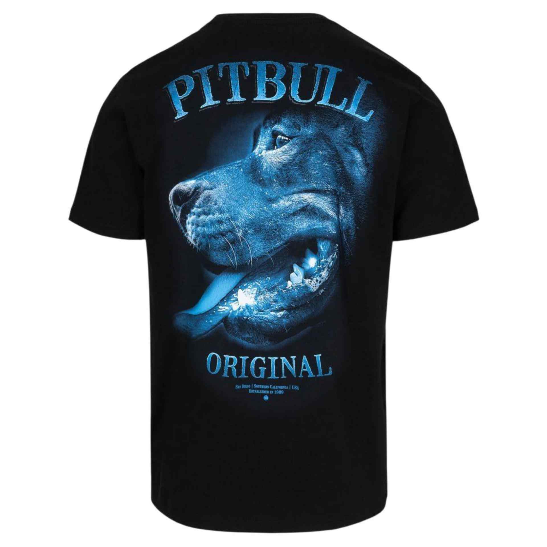 Das Pitbull West Coast T-Shirt „Midnight“ überzeugt mit einem markanten Look in Schwarz und kräftigem Blau. Auf der Vorderseite sorgt der dezente Logo-Schriftzug „Pitbull Original“ für ein klares Statement. Das Highlight ist der großflächige Rückenprint mit imposantem Pitbull-Motiv in leuchtendem Blau – kraftvoll, detailreich und einzigartig.