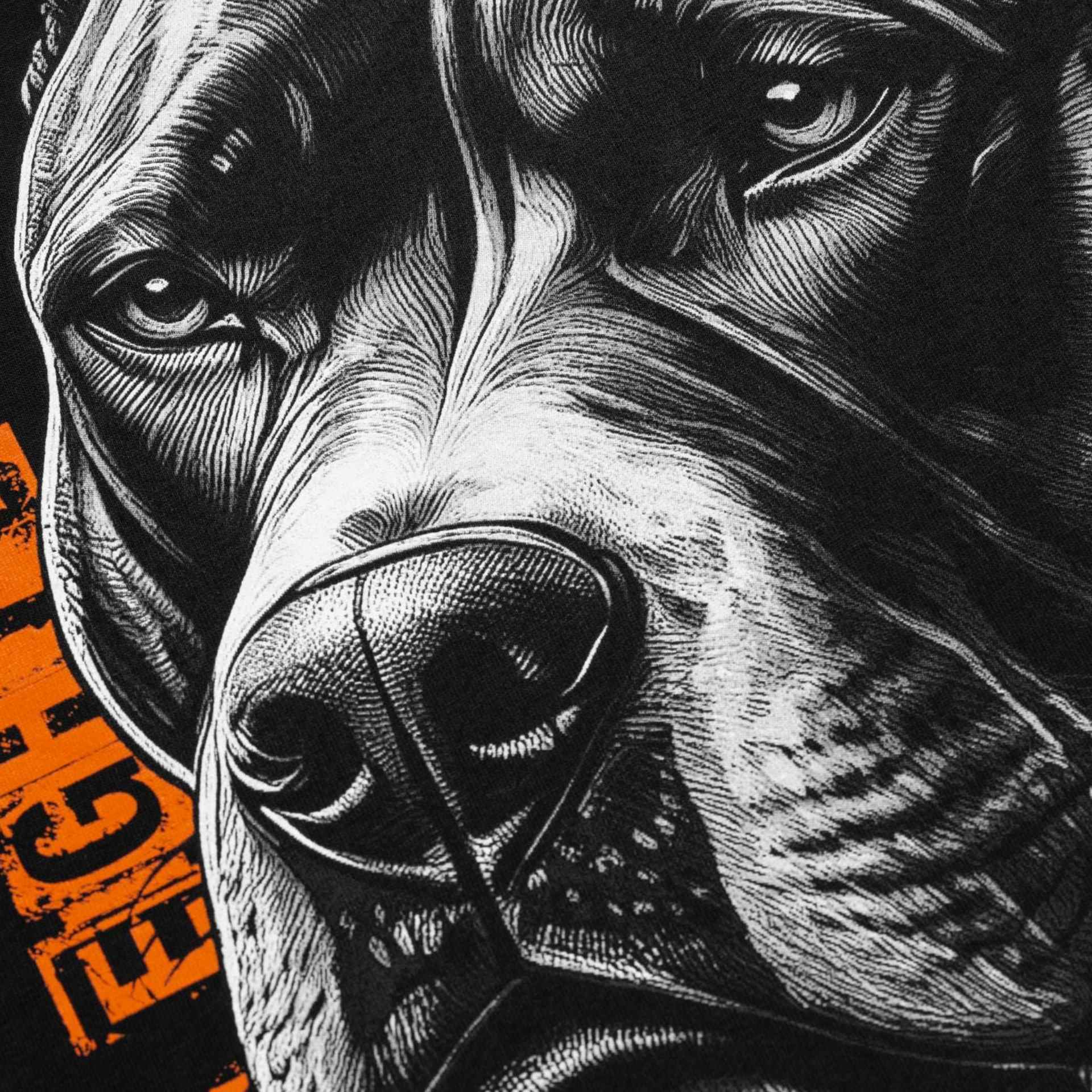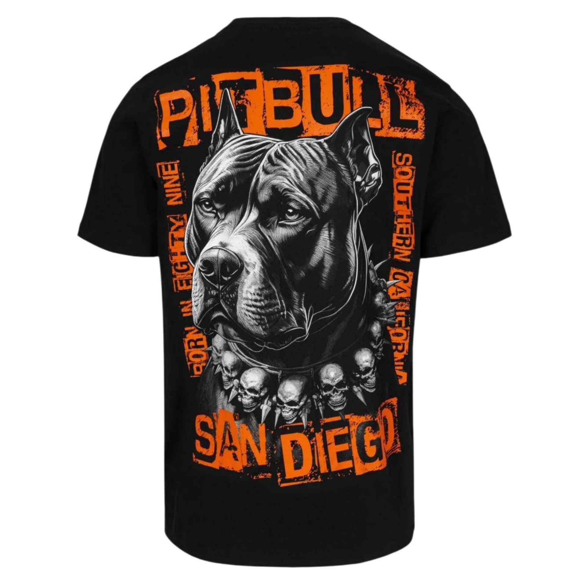 Das Pitbull West Coast T-Shirt „Blacky“ setzt auf einen kraftvollen Look mit markanten Details. Auf der Vorderseite zeigt sich ein auffälliger Frontprint mit dem Schriftzug PITBULL – Born in Eighty Nine in kräftigem Orange. Der Rückendruck macht das Shirt zu einem absoluten Highlight: Ein detailreich gezeichneter Pitbull-Kopf mit Ketten- und Totenkopf-Elementen, kombiniert mit den Schriftzügen San Diego und Southern California.