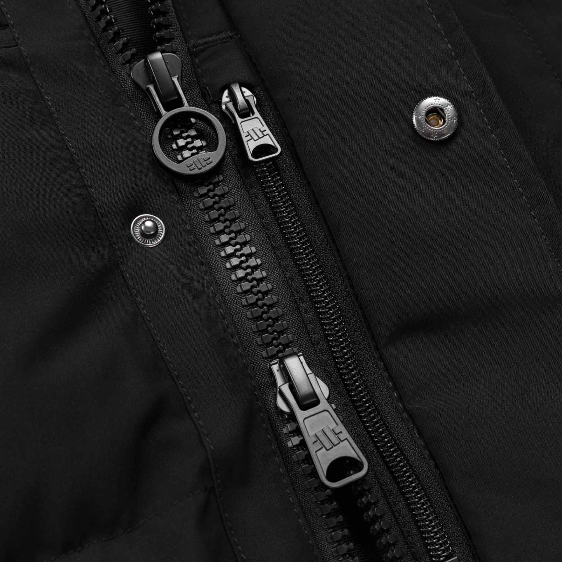 Das Fell (kein Echtfell) ist abnehmbar, ebenso die gefütterte Kapuze. Neben dem hochschließbaren Reißverschluss gibt es noch eine Windstopperklappe mit Druckknöpfen. Die unteren Einschubtaschen sind mit Reißverschluss versehen, die oberen mit Druckknöpfen; die aufgesetzten Fronttaschen ebenfalls mit Druckknöpfen. Im Inneren der Jacke gibt es drei Taschen mit Reißverschluss. Und zum krönenden Abschluss gibt es am linken Ärmel und am unteren Saum noch zwei Gummipatches.