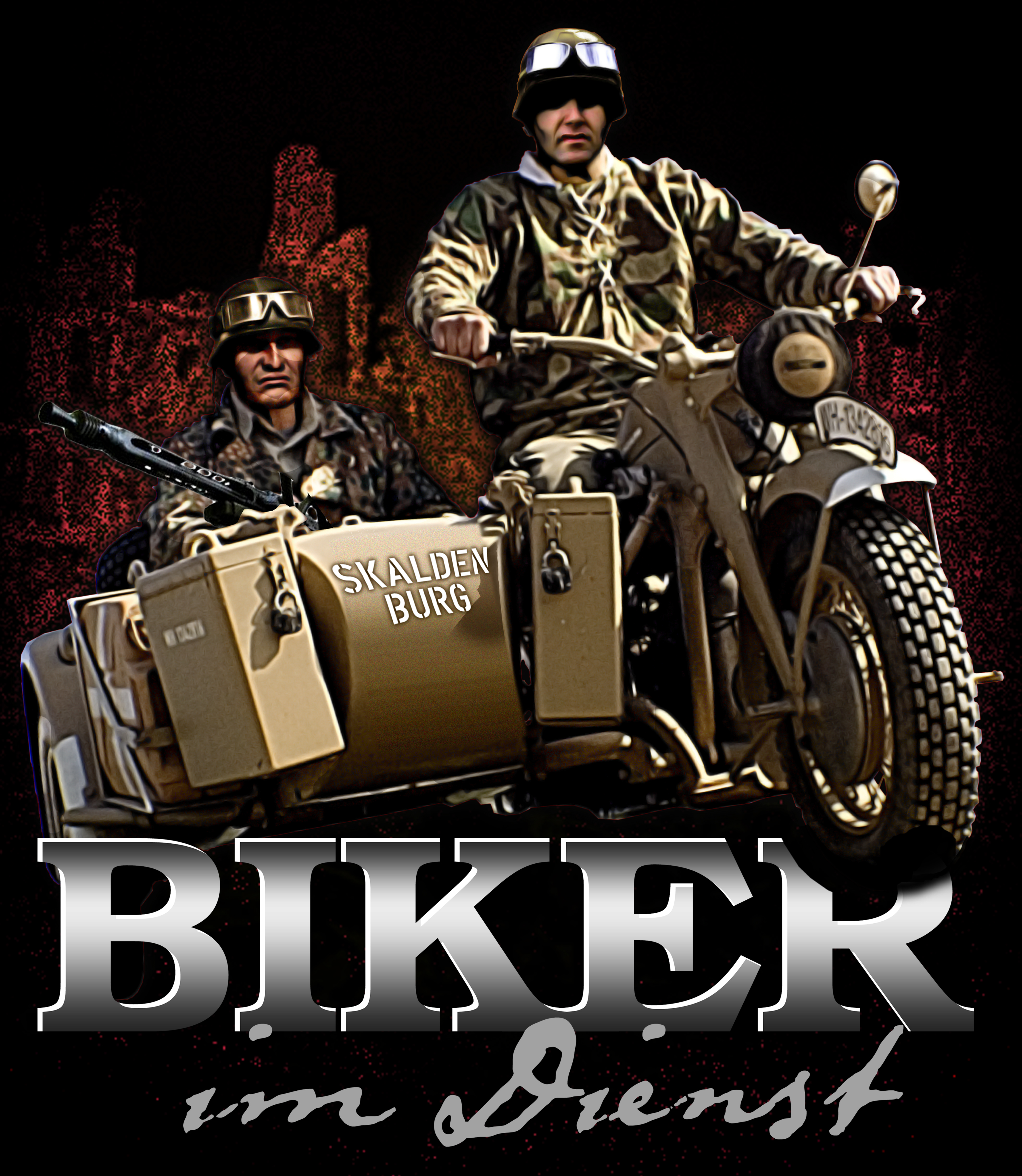 Skaldenburg Biker im Dienst T-Hemd mit großem Frontdruck. 100% Baumwolle