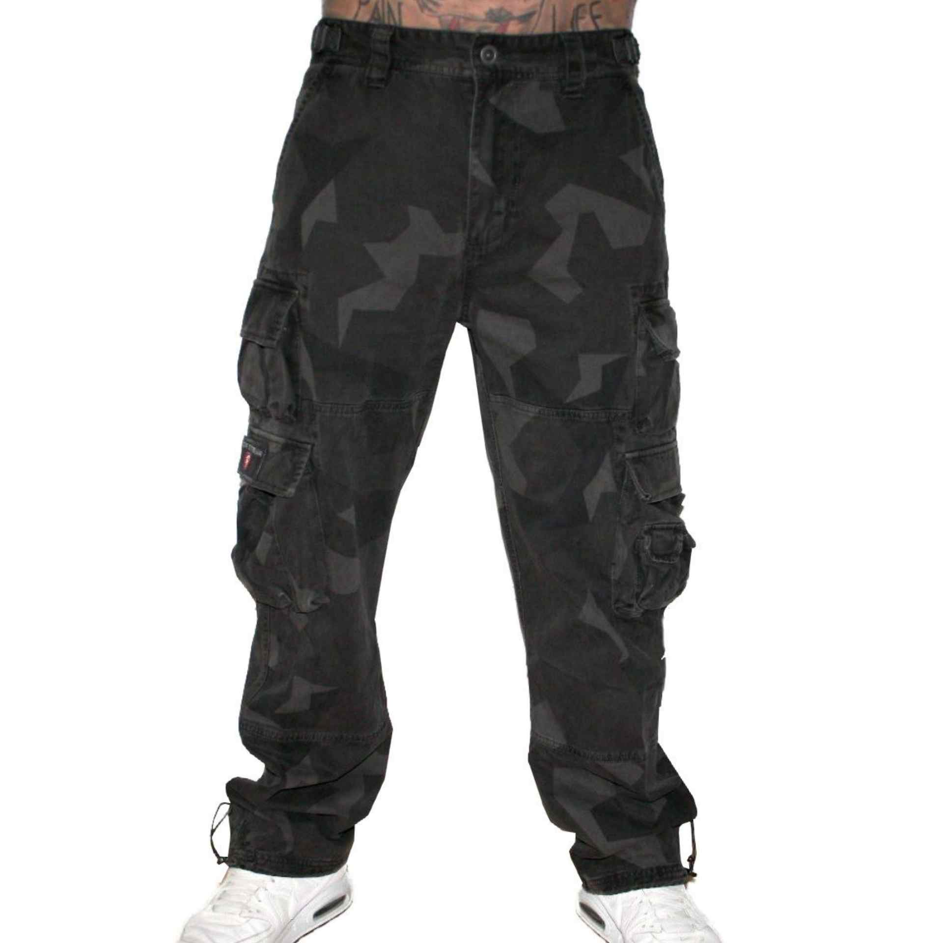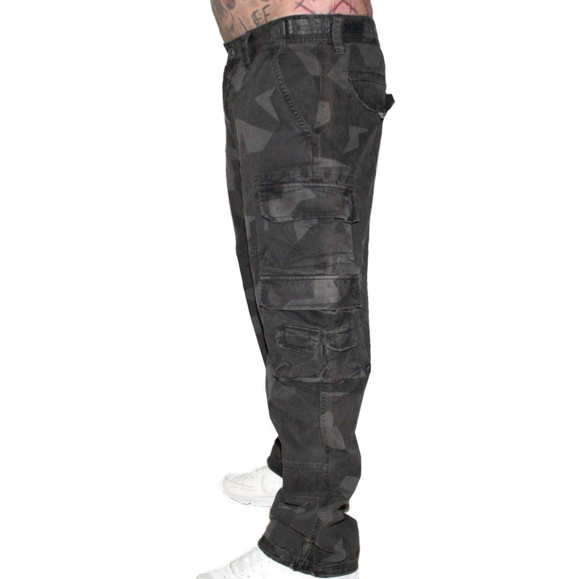 2 Einschubtaschen, 1 Kleingeldtasche, 2 Gesäßtaschen und 6 Seitentaschen, die Seitentaschen lassen sich per Knopf verschließen.