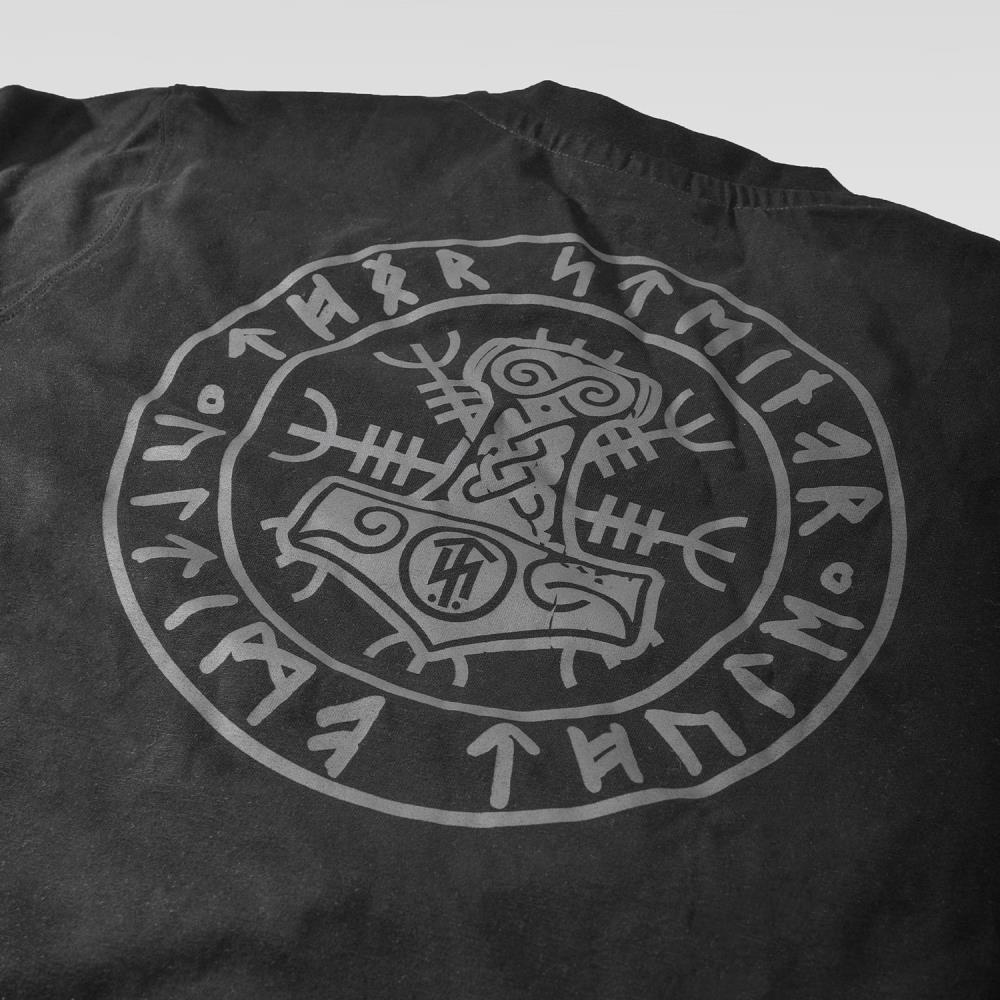 Kommt mit großem Rückendruck, auf dem Runen, das alte TS-Logo sowie ein riesiger Thorshammer zu sehen sind. Die Brust ziert ein kleiner Thorshammer. Kontrastnähte an Ärmeln und Saum sowie ein dezentes Label an der Seitennaht.