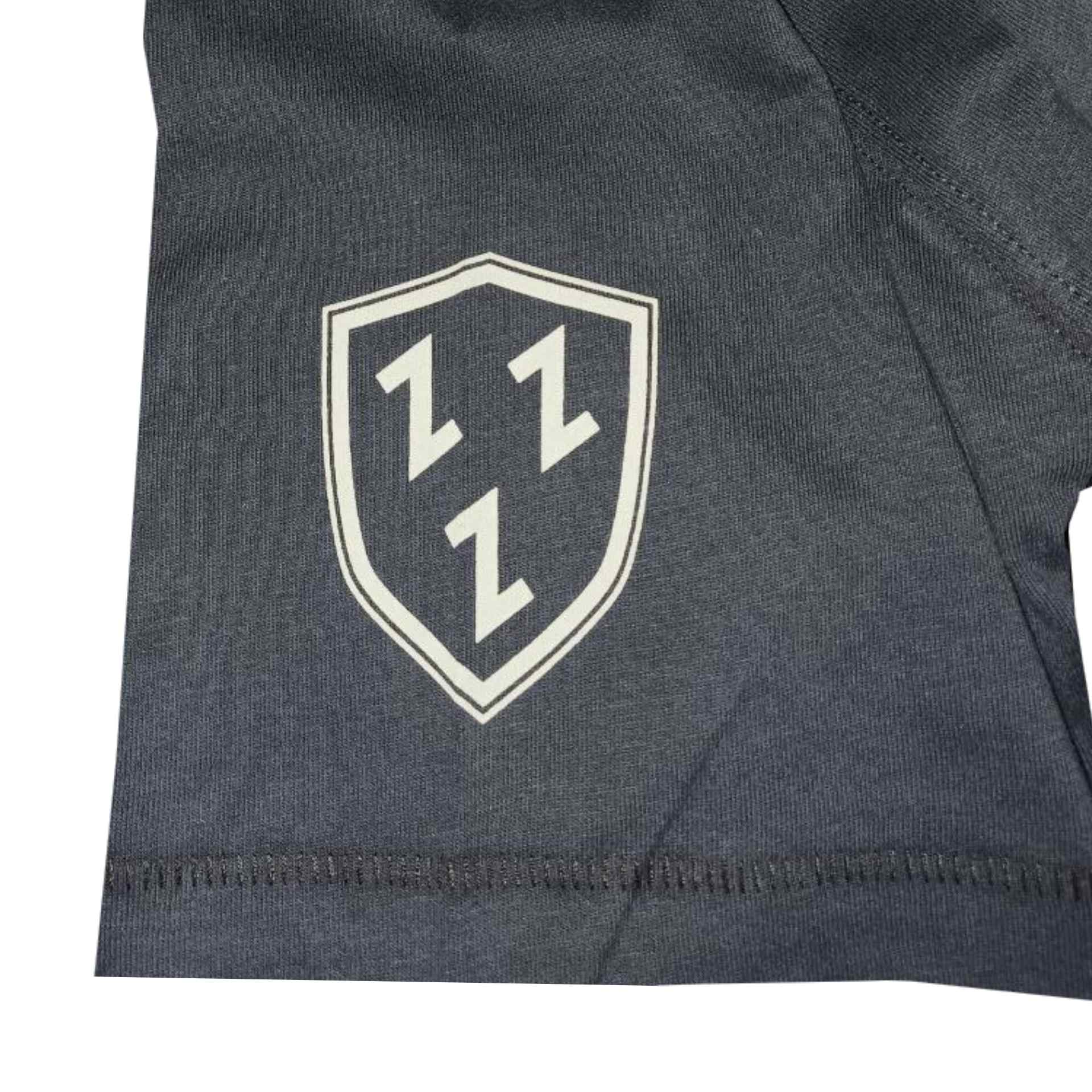 Vorne mit kleinem, rundem Brustdruck und einem Wappen auf dem linken Ärmel. Das Labelfähnchen sitzt – wie immer – an der Seitennaht.
