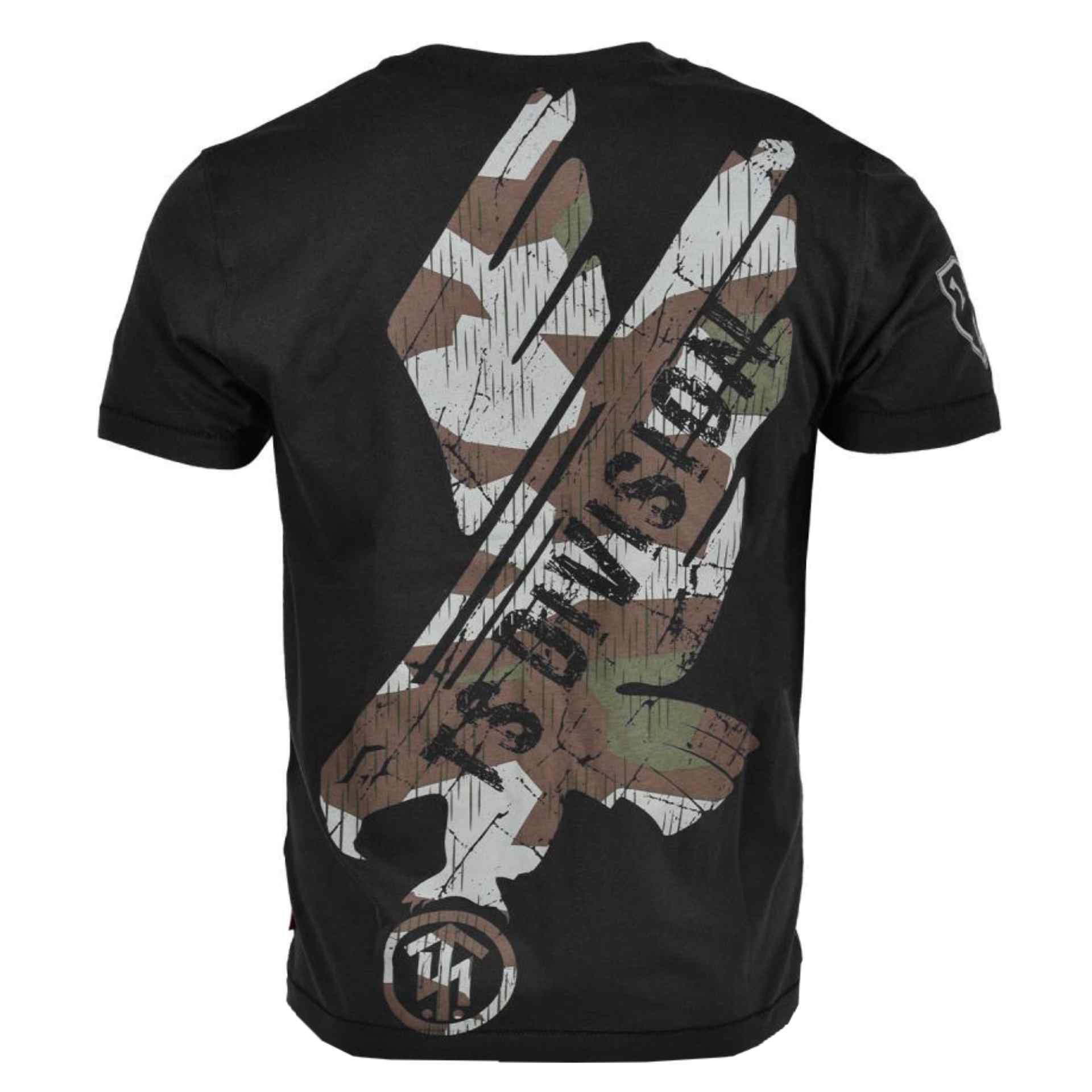 Auffälliges TS-Shirt mit großem Adler in Camouflage-Optik auf dem Rücken, der ein klassisches Thor Steinar Logo greift.