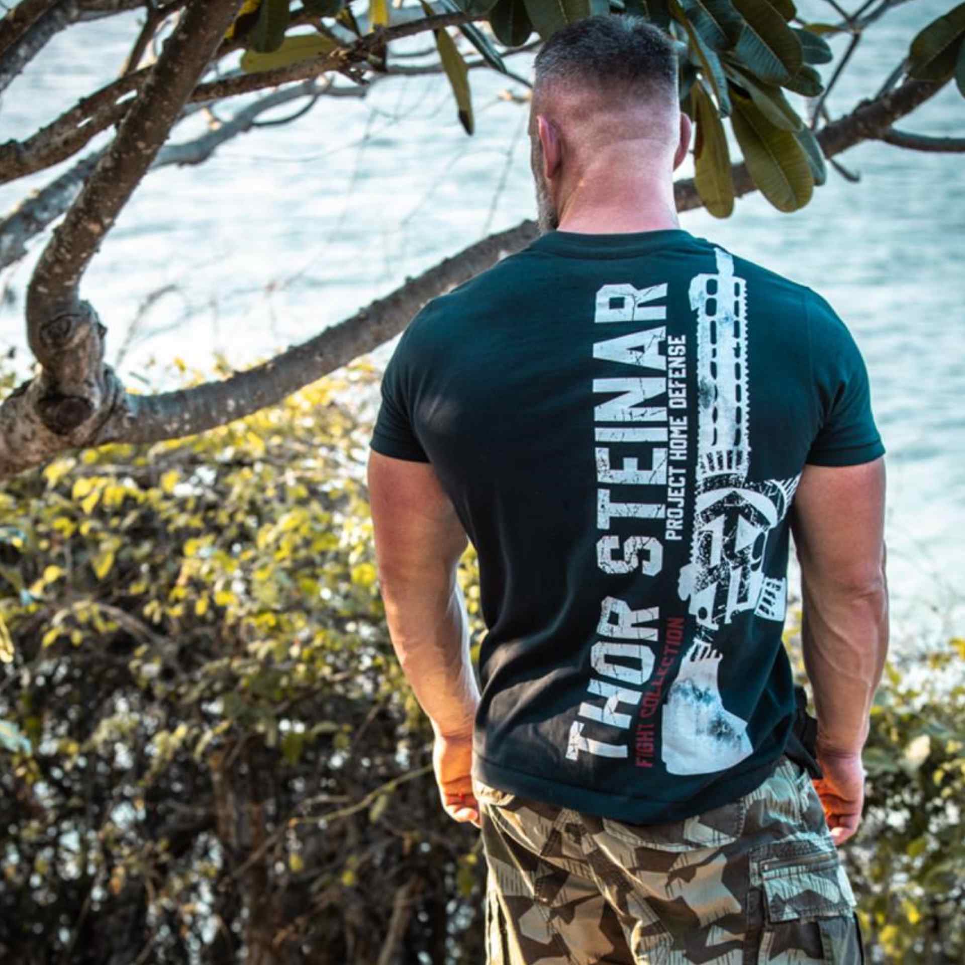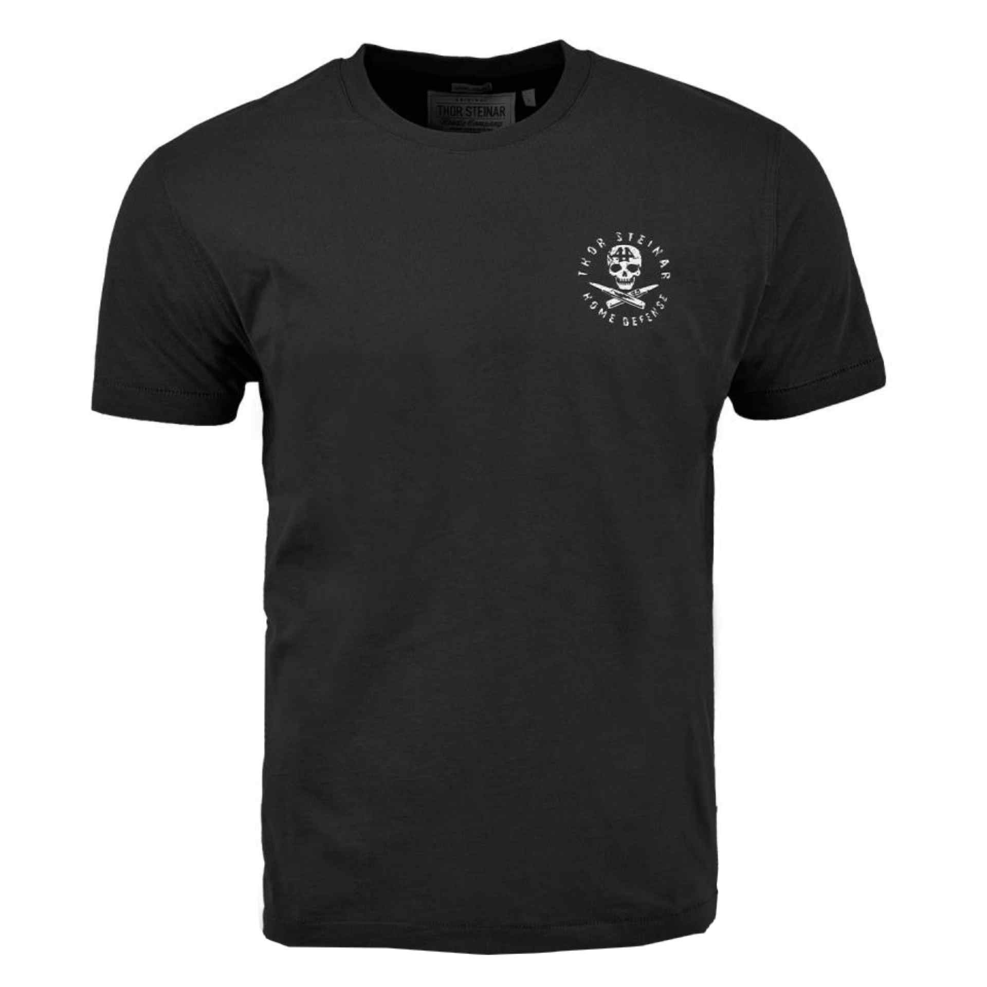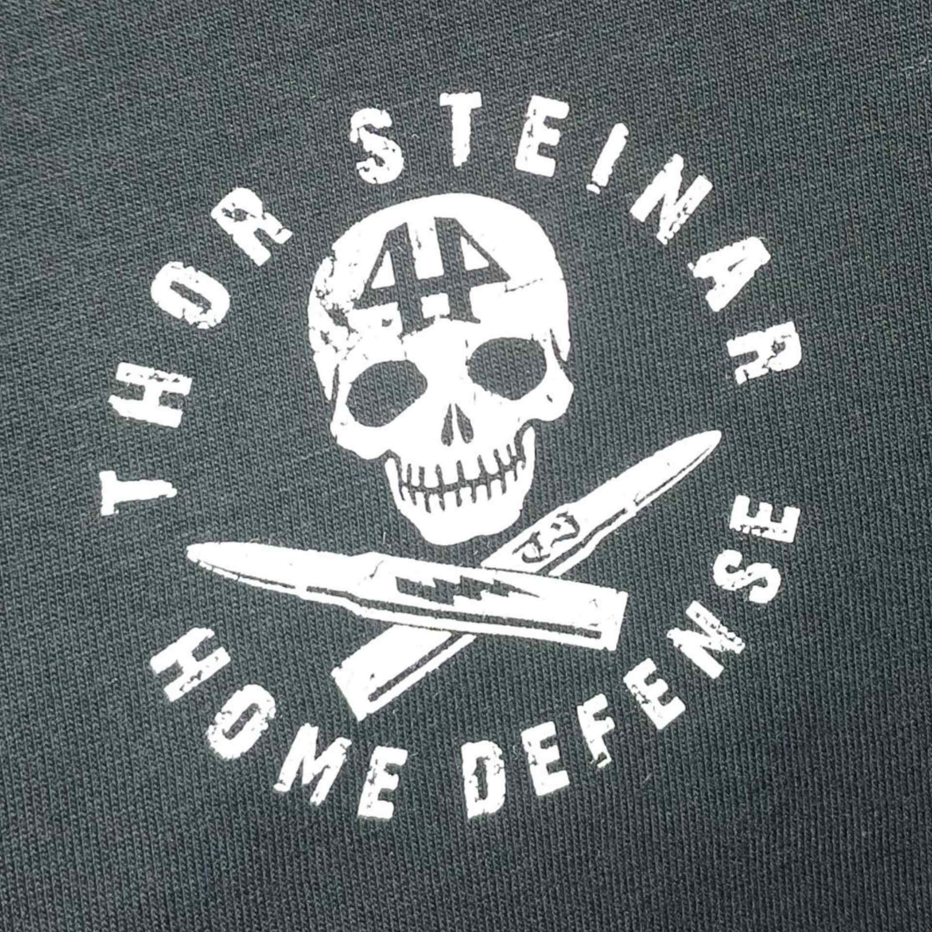 Großes, selbsterklärendes Rückenmotiv mit dem alten Thor-Steinar-Logo. Auf der Brust ein kleiner Totenkopf mit „Home Defense“-Schriftzug. Labelfähnchen wie immer an der Seitennaht.